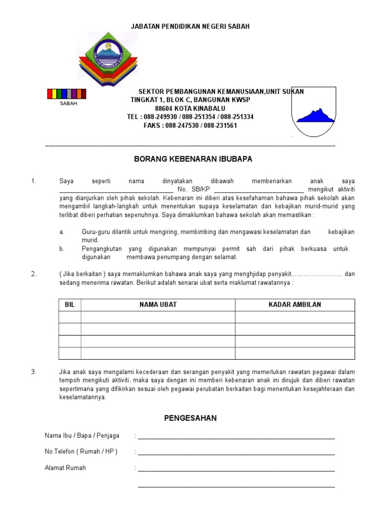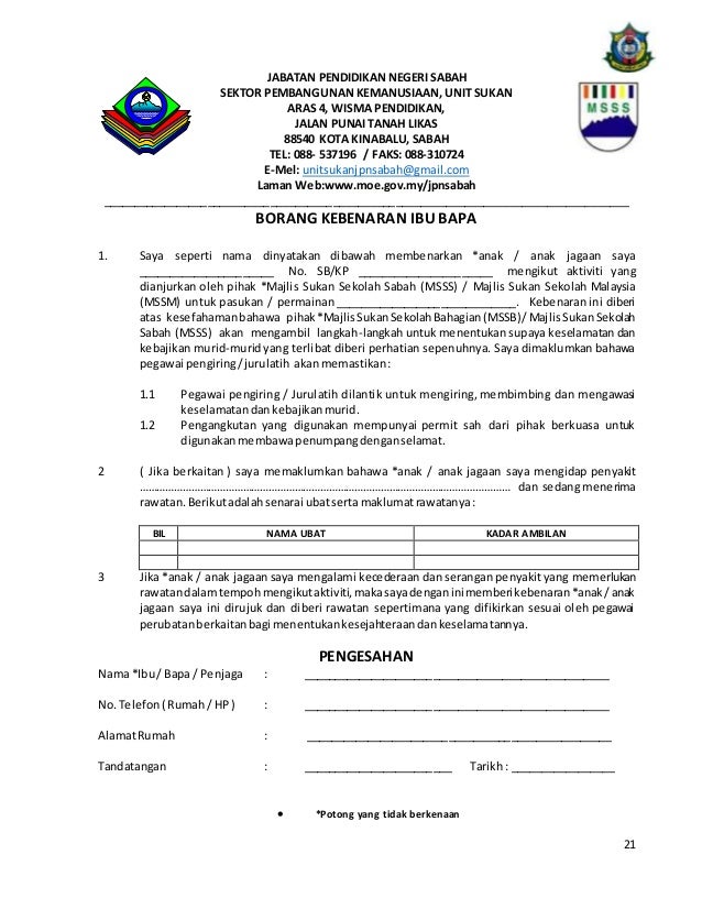 Borang Kebenaran Ibu Bapa Mssm Negeri Sabah / Turunkan tandatangan pemohon beserta tarikh permohonan.. Contoh surat kebenaran rentas negeri / borang permit pergerakan pkpb tersebut boleh melalui online je ehee. Ada versi pdf, ada versi gambar (format jpg, jpeg). Kawasan pentadbiran balai polis : Negeri sabah yang sering dirujuk sebagai negeri di bawah bayu merupakan satu daripada 14 negeri yang terdapat di malaysia dan negeri kedua terbesar bahasa malaysia adalah bahasa kebangsaan yang dituturkan hampir seluruh etnik di negeri ini dengan dialek sabah yang dipanggil baku. Anda boleh didakwa sekiranya gagal mengisi borang ini atau memberi maklumat palsu di bawah akta 342 pencegahan dan pengawalan penyakit berjangkit 1988.