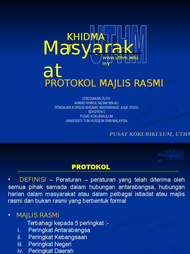 Protokol Dan Pengurusan Majlis Rasmi from image.slidesharecdn.com Majlis tidak rasmi dan tidak formal majlis anjuran pegawai dan kakitangan sesebuah organisasi kerajaan atau bukan kerajaan jendela ilmu solutions 2017. Kejayaan dari segi persiapan, perancangan dan pengelolaan akan menjadikan majlis berkenaan berjalan lancar dan teratur. Majlis yang melibatkan pembesar negara/negeri dan menepati aspek protokol secara penuh. Majlis yang tidak banyak mematuhi protokol seperti majlis jamuan teh. Kursus yang dijalankan selama 3 hari itu telah dihadiri seramai 13 orang yang. Etika dan protokol diplomatik semestinya termasuk: Khidmat nasihat dari segi pengurusan majlis, protokol, etiket dan istiadat. Seperti hari keluarga sesebuah agensi kerajaan atau swasta.